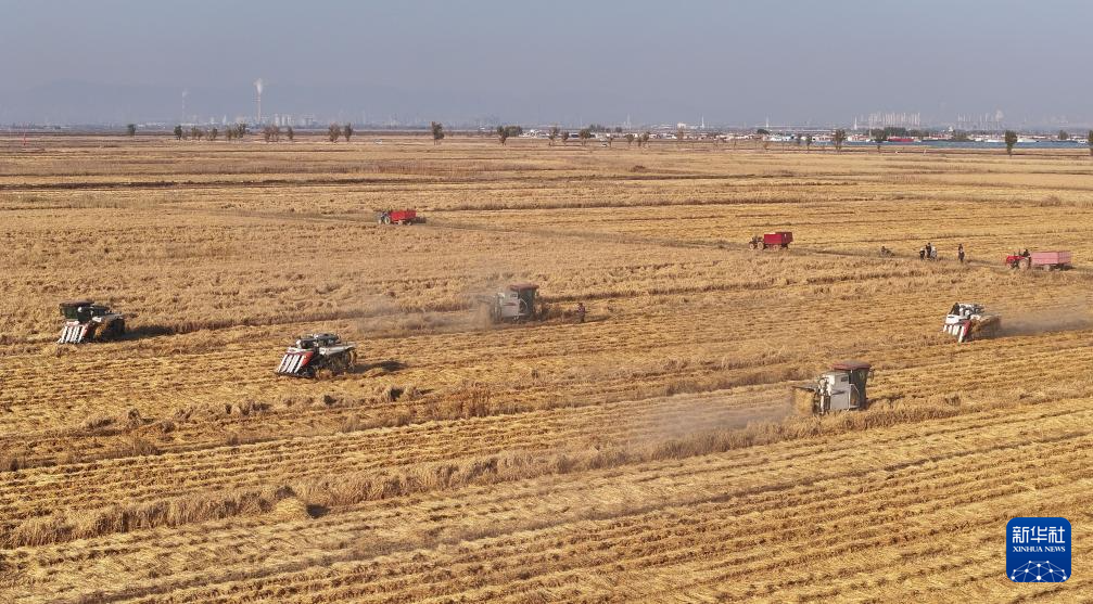 10月28日,内蒙古鄂尔多斯市达拉特旗昭君镇沙格都村,农民推着收割机收割水稻(无人机照片)。近日,黄河“拐弯”顶部天气晴好,农民们抓紧时间收割庄稼。今年当地降雨频繁,导致沿河部分地区积水、地面潮湿。连日来大型机械无法进田作业,黄河沿岸部分田地秋收工作推迟。新华社记者 贾丽君 摄