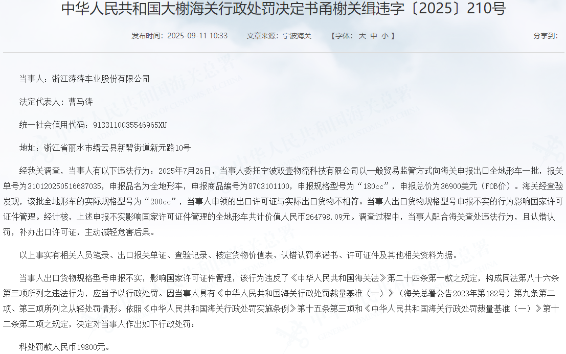 9月24日,北京中国经济网络北京(301345.SZ)揭示了计划在9月20日在香港有限公司的证券交易所发布H共享和清单。为了促进公司的全球战略布局,增强国际品牌的影响力,增强海外融资能力,并建立一个国际资本运营平台,以进一步提高公司的全面竞争力,该公司在第四届董事会和第四届董事会会议上举行了第九届董事会会议,并在9月19日的公众审查中,并审查了2025年的公众申请,并审查了2025年,并申请了竞选活动,并审查了企业,并在2025年进行了审查,并将其置于竞选活动。香港交易所的主要董事会(因此,定义为“ H股份的发行和列表)”)。发行公司的H股和公司列表仍将提交公司的股东会议,以进行审查,并且必须获得相关政府机构和监管机构的批准,批准或提交,例如中国证券监管委员会,香港证券交易所和洪恩证券委员会和国际股份的利益。为了在会议决议的股东有效性期间完成发布窗口(即,自审查之日起24个月,股东会议或2025年9月18日的其他时期,托托奥汽车行业以来股价自此以来的股票价格为257.99 yuan。此列表以来列出了托托行业。 27,333,600,价值占SH总资本的25.00%发行后的art。该新闻稿不参与公司股东的公开募股。该公司的发行价格为每部分73.45元。该公开发行的托托瓦汽车行业筹集的资金总额为2007.65.29亿元人民币,降低释放成本后筹集的净资金净额为1865.2197亿元人民币。筹集的最终净公司基金比原始计划高的1.265197亿元。招股说明书在2023年3月14日透露,该公司计划筹集每年100万辆智能电动汽车的建设项目的6亿元人民币,这是改善所有地形工具制造的智能项目,R&D中心的建设中心项目,营销平台项目,营销平台项目以及补充资本。 Taotao汽车行业(首席承销商)赞助商是Zhejiang Securities Co,Ltd,以及赞助商代表Sun XIaoli和Ran Chengwei。释放托托行业的总成本为1.42432亿元人民币,其中Zhejiang Securities Co,Ltd。在2025年上半年,该公司的营业收入为171.13亿元,每年增长23.19%;与股东相关的净利润为3.42亿元人民币,每年增加88.04%;与股东相关的净利润为3.39亿元人民币,增长了89.65%;每个部分的基本收入为3.15元。在2025年上半年,该公司的销售成本同比下降3.26%,管理成本相同。比例增加了17.78%,而研发投资同比增长11.00%。 2025年9月11日,宁波海关网站披露了中华人民共和国的行政罚款决定,Yongxieguan Jiyyzi [2025]均显示没有。有限公司通过通用贸易管理局宣布一批出口全地形车向海关。海关声明号IS 310120250516687035,声明的产品名称是所有地形车,声明的产品编号为8703101100,规定的规范模型为“ 180cc”,规定的总价为36,900美元(FOB价格)。检查后,海关发现,这批全地形车辆的实际规格和模型为“ 200cc”,而托托(Taotao)车辆行业申请的出口许可与实际出口商品不符。出口规格和模型的当事方的错误声明错误地影响了国家许可的管理。计算后,影响国家许可证管理的全地形车辆的总成本为264,798.09元。在调查期间,托托瓦(Taotao)的车辆行业与习惯合作调查和惩罚非法行为,承认错误和罚款,并出口许可证,以积极缓解伤害后果。表达托托车辆出口商品的规格和模型行业是错误的,影响了假牌许可。这种行为违反了《中华人民共和国海关法》第24条第1款的规定,并列出了同一法律第36条第86条中列出的非法法。应施加行政处罚。因为塔托车辆行业有第9条,第2款和第3款的“海关行政罚款准则”第3条和第3款(i)的第15条第15条规定的《海关行政规定》第3条规定,《自定义判决》第15条规定,《自定义及其自定义的行政》第15条规定,中华人民共和国的行政处罚(i)”决定对托托瓦汽车(Taotao Automobile)施加以下行政处罚:19,800元人民币的TATA部分。经济观察家最近发布了一份报告。在美国出售“老人欢乐”的Omobile行业希望IPO储备香港股票。踏板车和电动汽车主要是道路车辆,包括所有车辆和越野摩托车,而托塔的摩托车的目标是对特殊的产品,而其产品的销售额为2025年。此外,公司的总收入是78.11%。中部和南美,欧洲和其他地区的S市场。